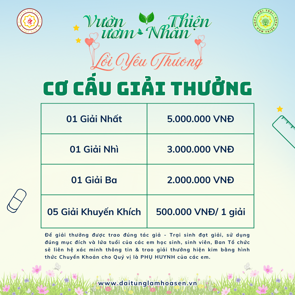 📬 HÌNH THỨC & QUY ĐỊNH TRAO GIẢI: Để giải thưởng được trao đúng tác giả - Trại sinh đạt giải, sử dụng đúng mục đích và lứa tuổi của các em học sinh, sinh viên, Ban Tổ chức sẽ liên hệ xác minh thông tin & trao giải thưởng hiện kim bằng hình thức Chuyển Khoản cho Quý vị là PHỤ HUYNH của các em.