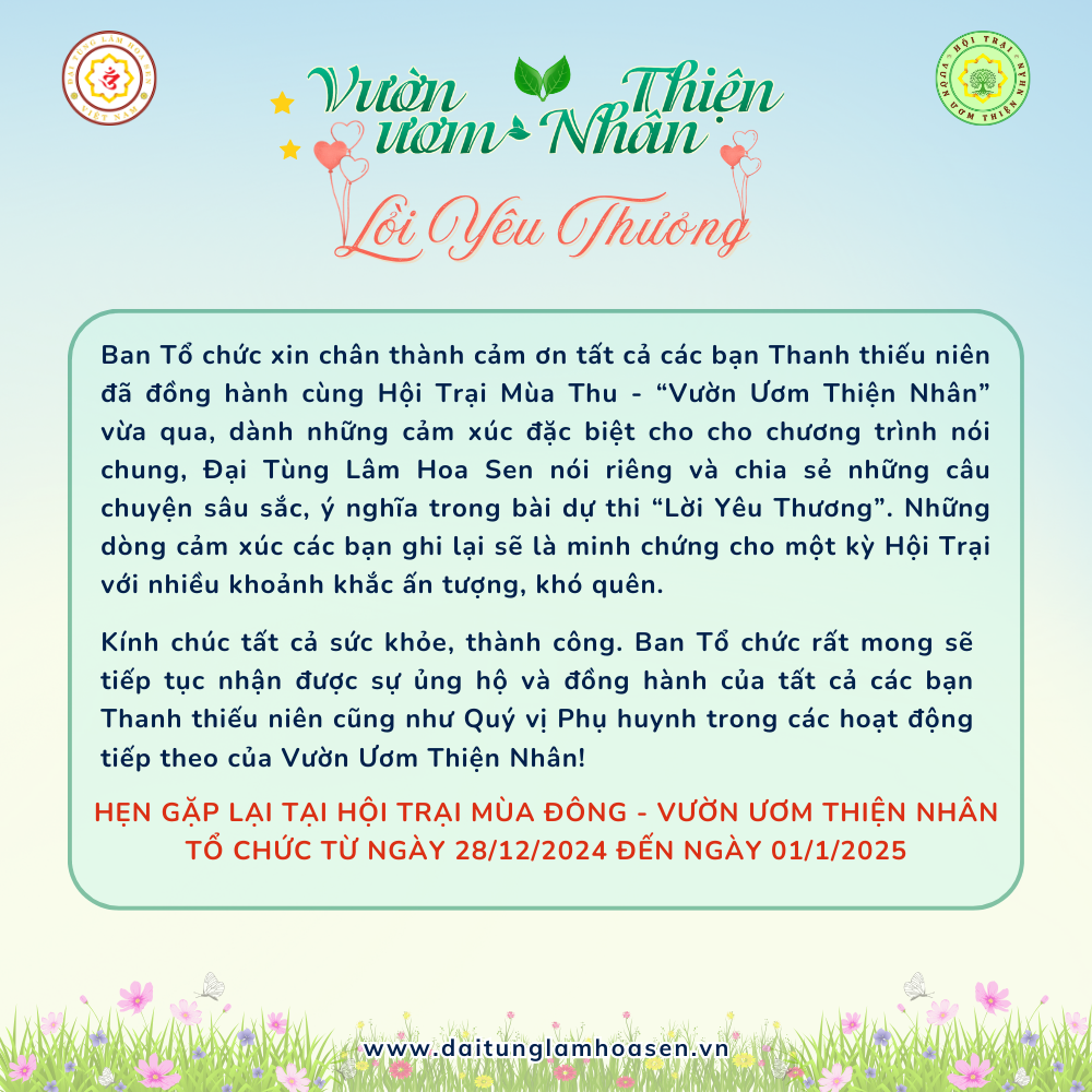 Một lần nữa, BTC xin chân thành cảm ơn tất cả các bạn Thanh thiếu niên đã đồng hành cùng Hội Trại Mùa Thu - “Vườn Ươm Thiện Nhân” vừa qua, dành những cảm xúc đặc biệt cho cho chương trình nói chung, Đại Tùng Lâm Hoa Sen nói riêng và chia sẻ những câu chuyện sâu sắc, ý nghĩa trong bài dự thi “Lời Yêu Thương”. Những dòng cảm xúc các bạn ghi lại sẽ là minh chứng cho một kỳ Hội Trại với nhiều khoảnh khắc ấn tượng, khó quên.