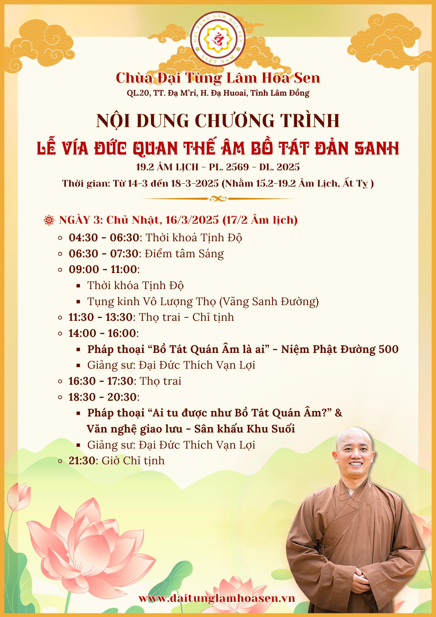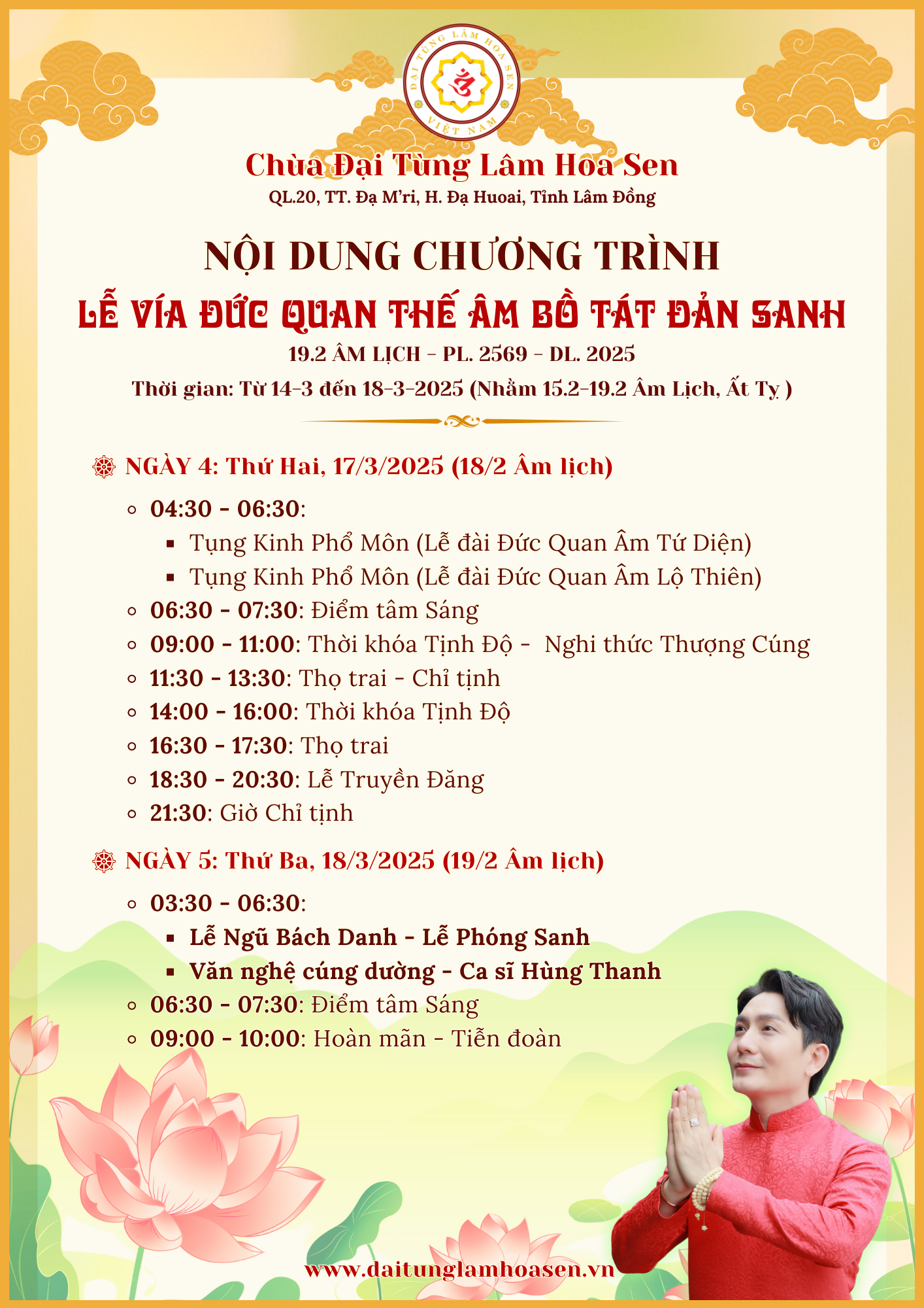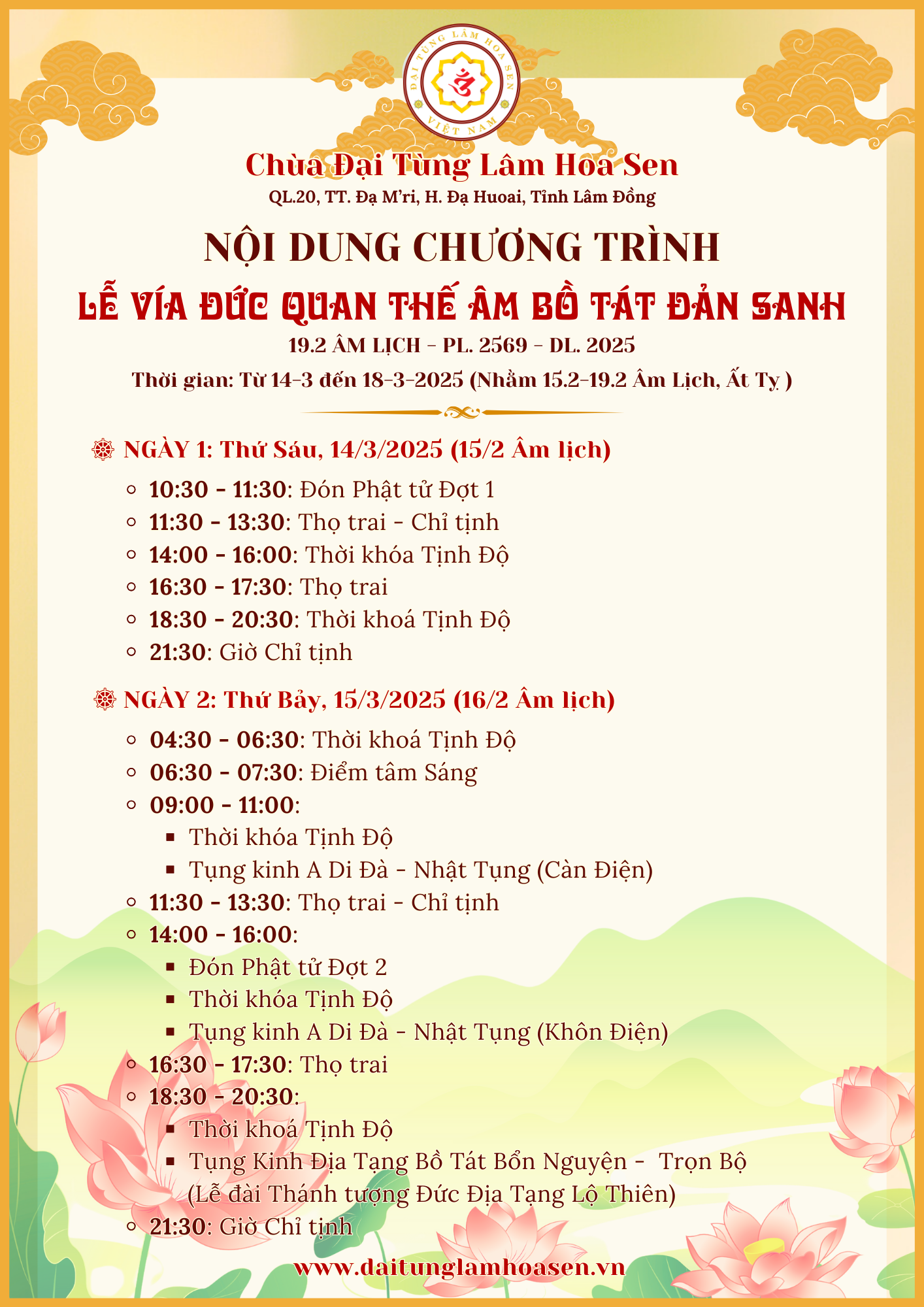 Nhằm tạo duyên lành để các Phật tử, Liên hữu đồng tu thiện nam, tín nữ cùng đại chúng xa gần về tham dự và cộng tu cùng đạo tràng, sắp tới đây, Đại Tùng Lâm Hoa Sen tổ chức Lễ Vía Đức Quán Thế Âm Bồ Tát Đản Sanh PL.2569 để tất thảy những người con Phật cùng quy hướng về chùa tu tập, cảm niệm ân đức cứu khổ tầm thanh của Bồ Tát Quán Thế Âm và cùng sống trong trái tim từ bi, sống trong hương lành của Mẹ hiền Quán Âm.