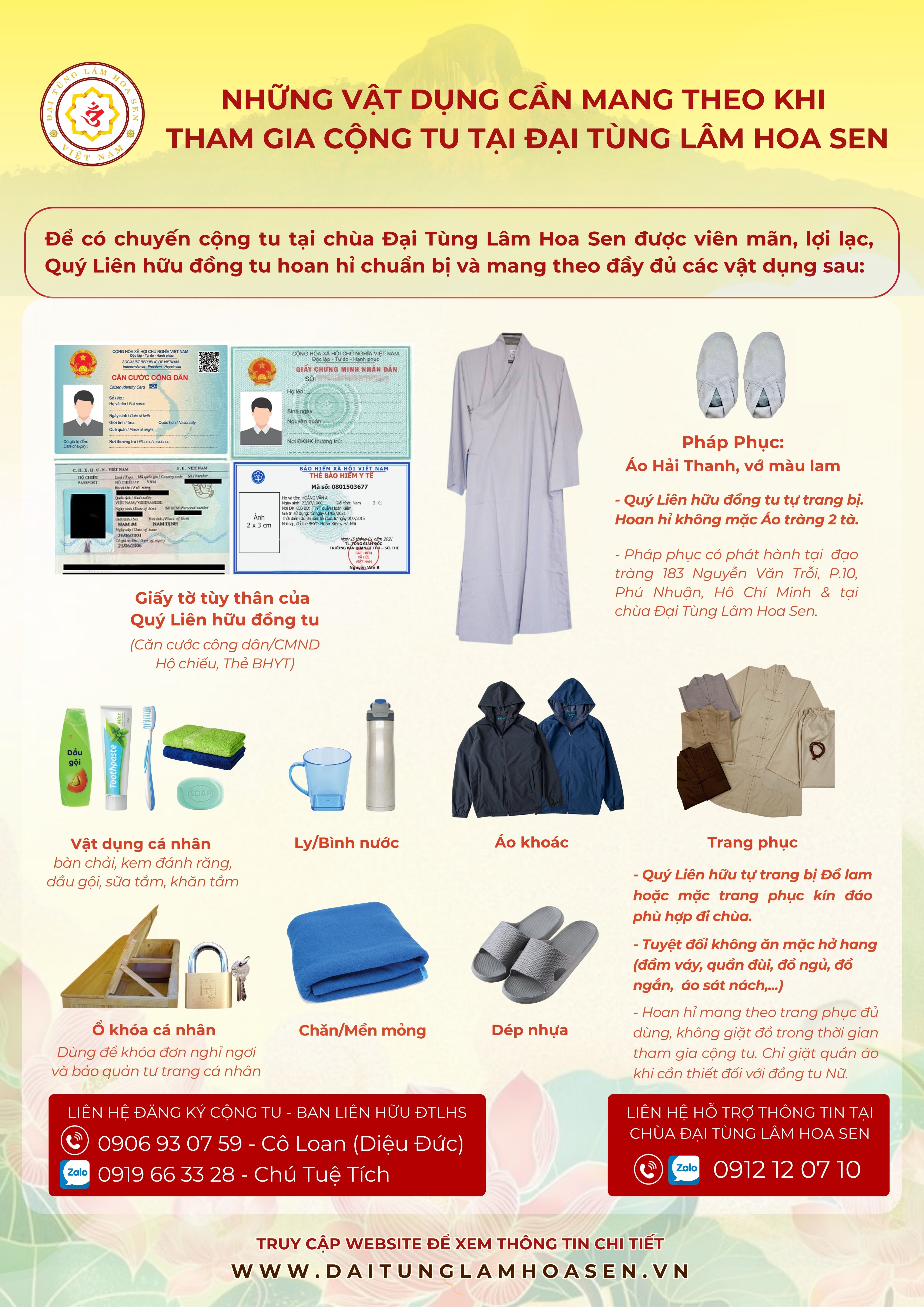 6. Các vật dụng Quý Liên hữu cần mang theo & Lưu  ý khi tham gia Cộng tu tại chùa Đại Tùng Lâm Hoa Sen: