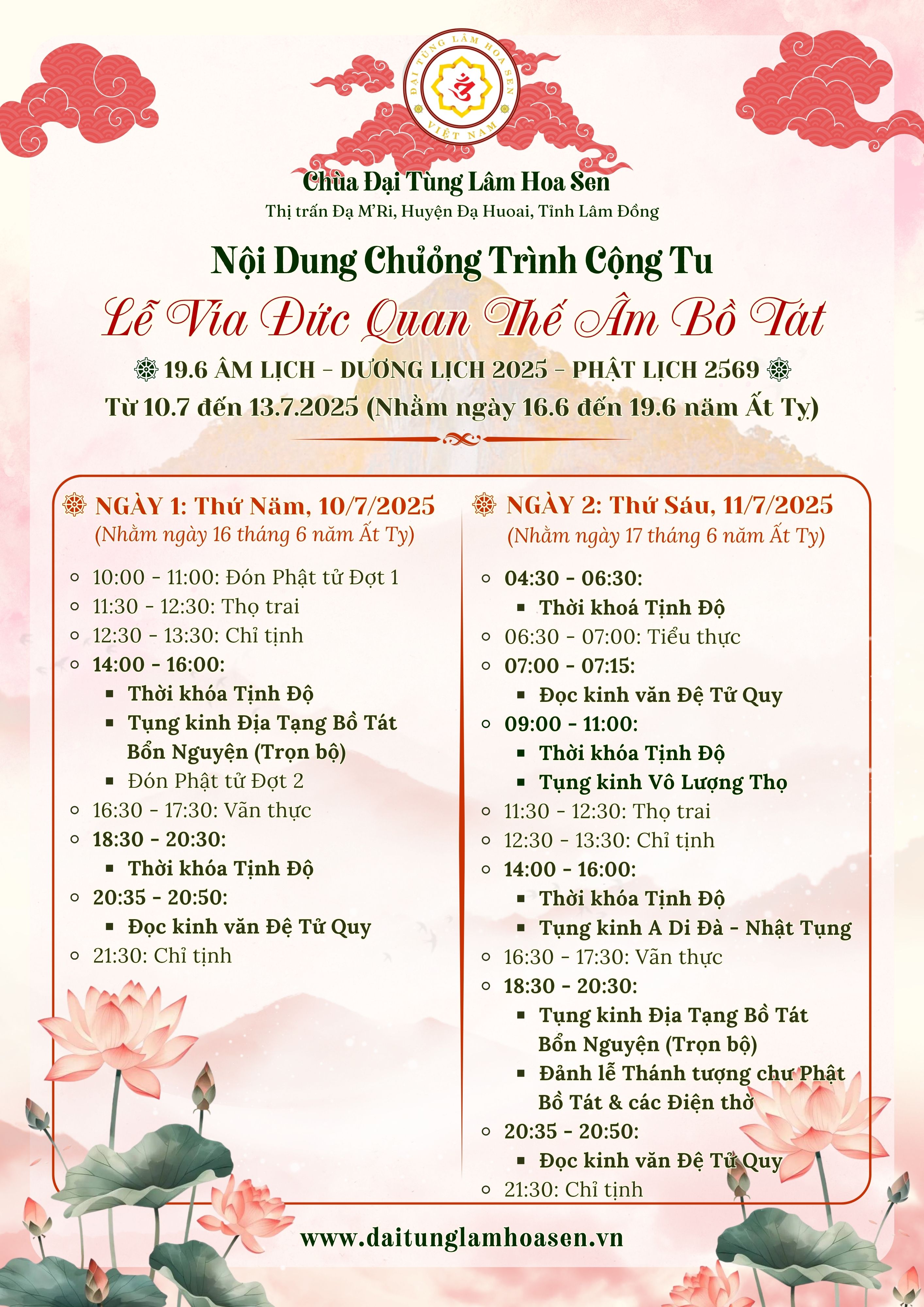 Nhằm tạo duyên lành để các Phật tử, Liên hữu đồng tu thiện nam, tín nữ cùng đại chúng xa gần về tham dự và cộng tu cùng đạo tràng, sắp tới đây, Đại Tùng Lâm Hoa Sen tổ chức Lễ Vía Đức Quán Thế Âm Bồ Tát Thành Đạo PL.2569 để tất thảy những người con Phật cùng quy hướng về chùa tu tập, cảm niệm ân đức cứu khổ tầm thanh của Bồ Tát Quán Thế Âm và cùng sống trong trái tim từ bi, sống trong hương lành của Mẹ hiền Quán Âm.