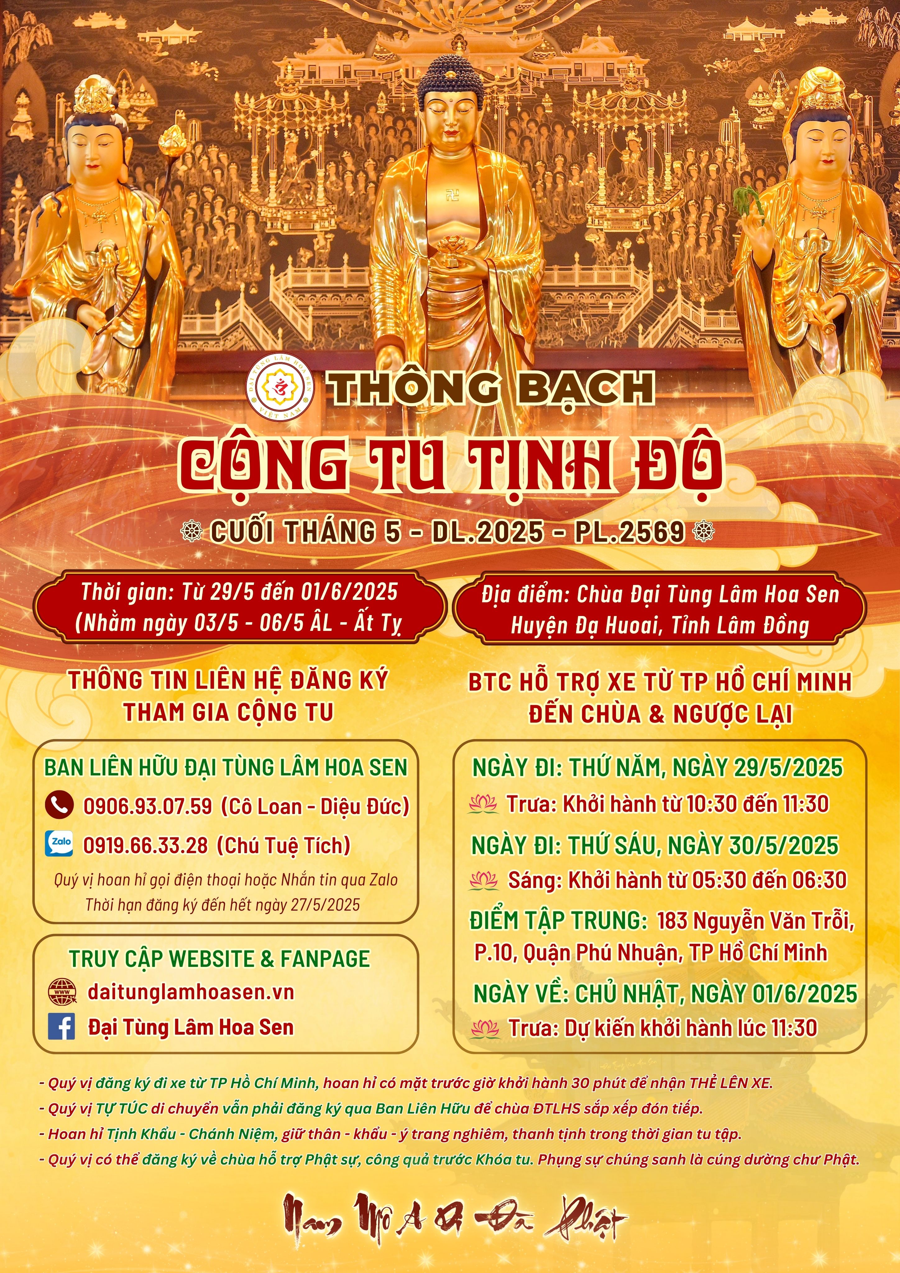 - Đối với Quý Liên hữu đăng ký xuất phát từ TP Hồ Chí Minh: Ban Tổ chức có hỗ trợ xe di chuyển đến Đại Tùng Lâm Hoa Sen và ngược lại. Quý Phật tử vui lòng có mặt trước giờ khởi hành 30 phút để nhận THẺ LÊN XE.