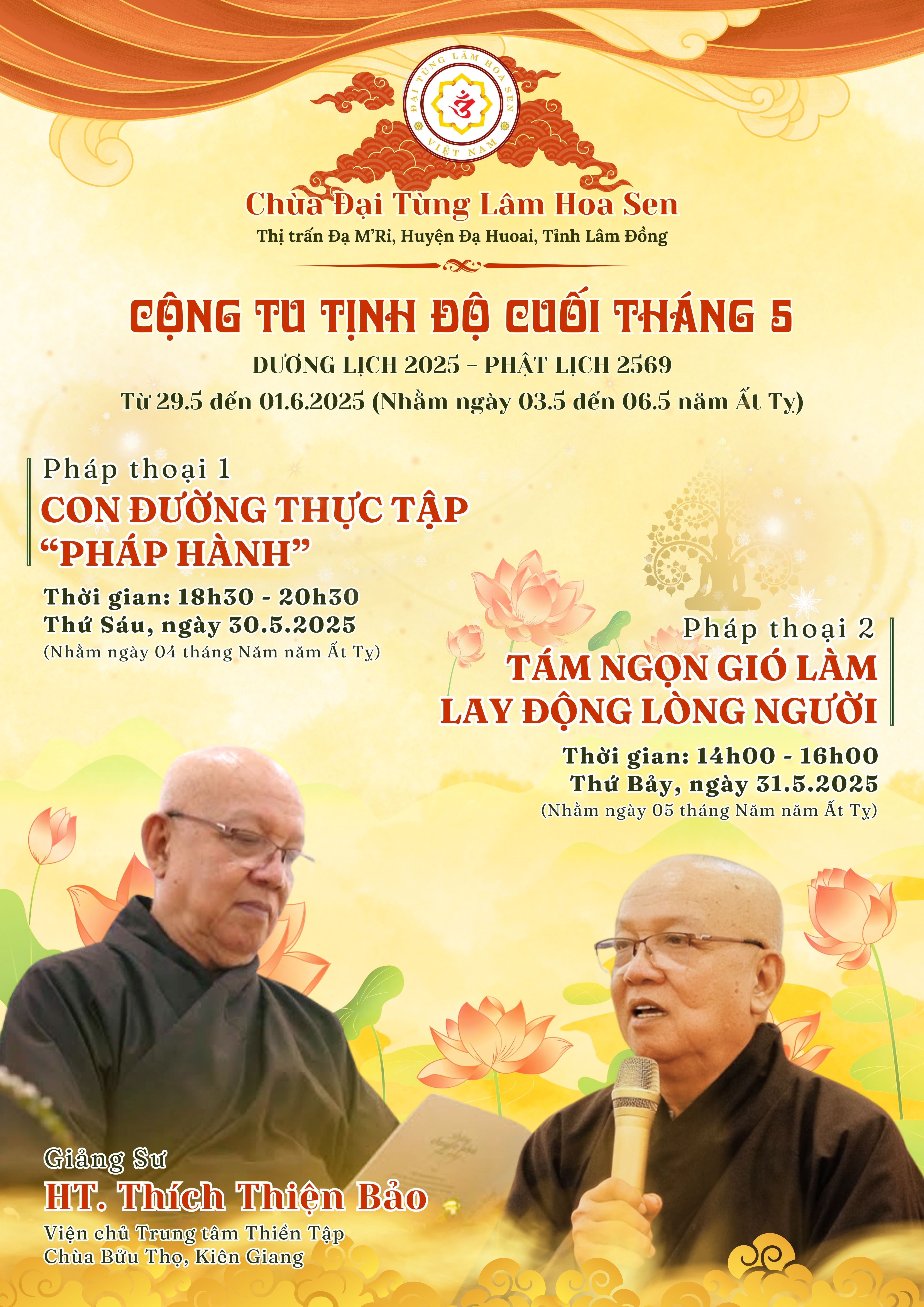 1. Thời gian tổ chức: Khóa Tu diễn ra trong 04 ngày | Từ ngày 29/5 đến 01/6/2025 - Thứ Năm đến Chủ Nhật, (Nhằm ngày 03/05 đến 06/05 năm Ất Tỵ).