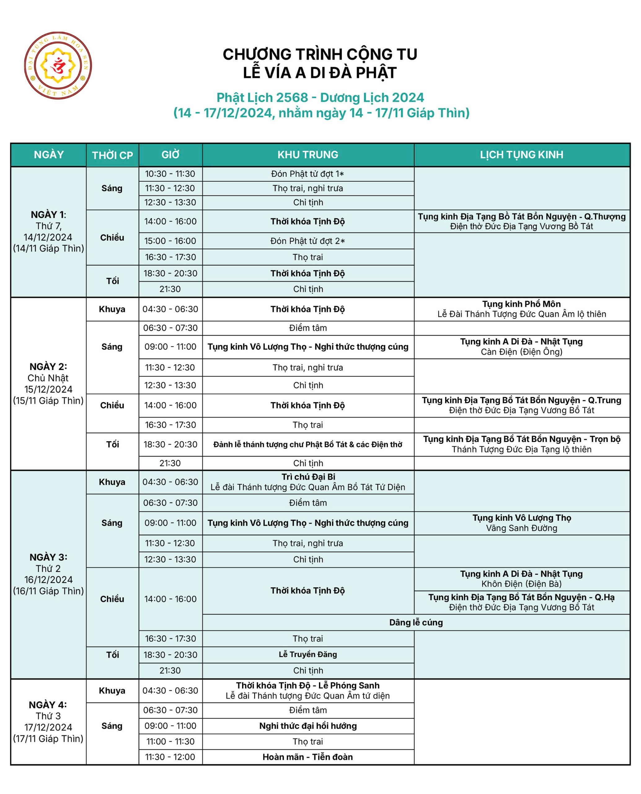 1. Thời gian tổ chức: Pháp hội diễn ra trong 04 ngày | Từ ngày 14/12 đến 17/12/2024 (Nhằm ngày 14/11 đến 17/11 năm Giáp Thìn).