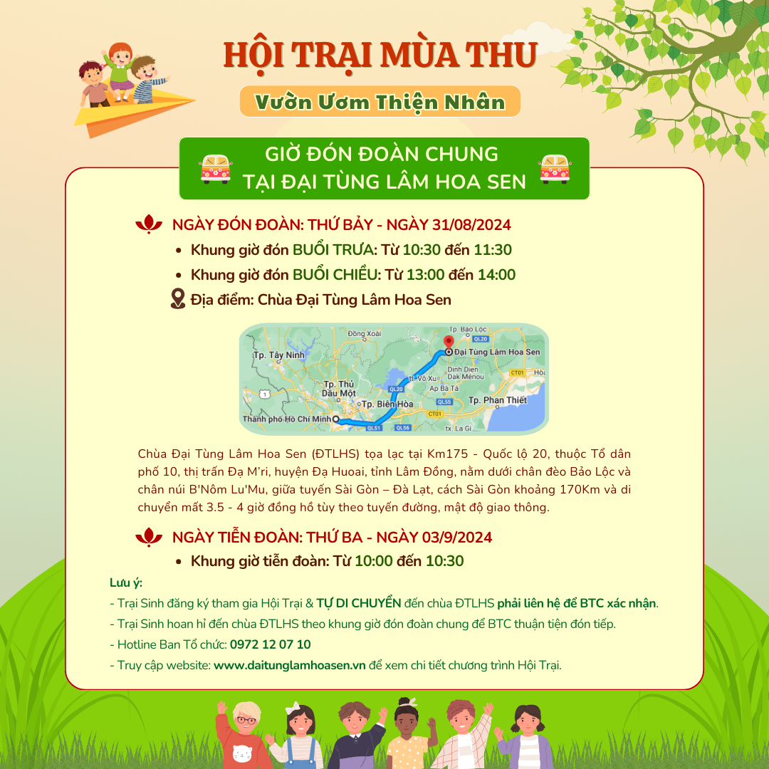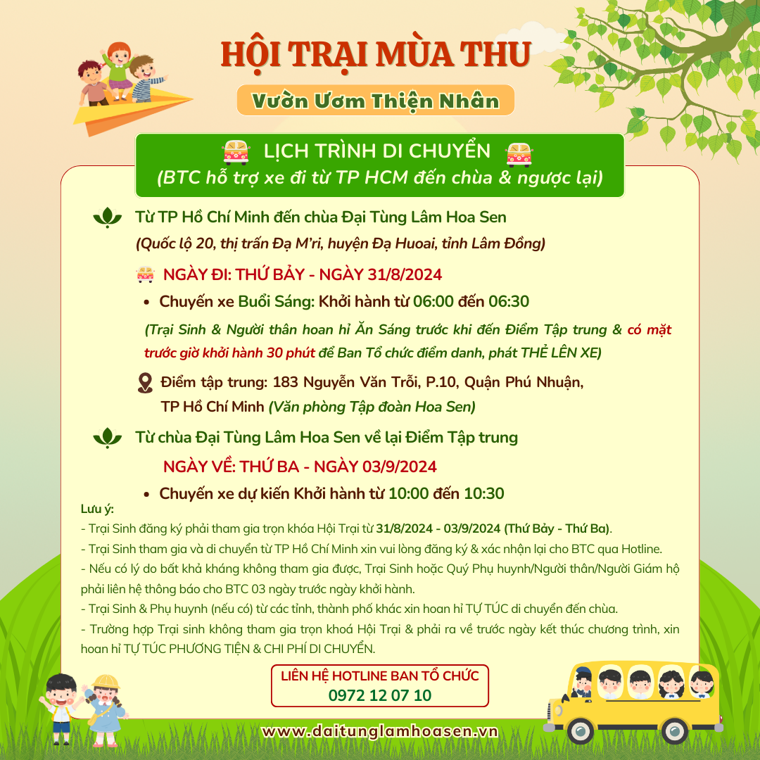 - ĐỐI VỚI QUÝ TRẠI SINH DI CHUYỂN THEO XE CỦA BAN TỔ CHỨC TỪ TP HỒ CHÍ MINH: BTC sẽ bố trí xe đưa Trại sinh & Phụ huynh hoặc Người thân / Người Giám hộ (nếu có) di chuyển từ Văn phòng đại diện của Tập đoàn Hoa Sen tại TP Hồ Chí Minh đến chùa Đại Tùng Lâm Hoa Sen (Lâm Đồng) và ngược lại.