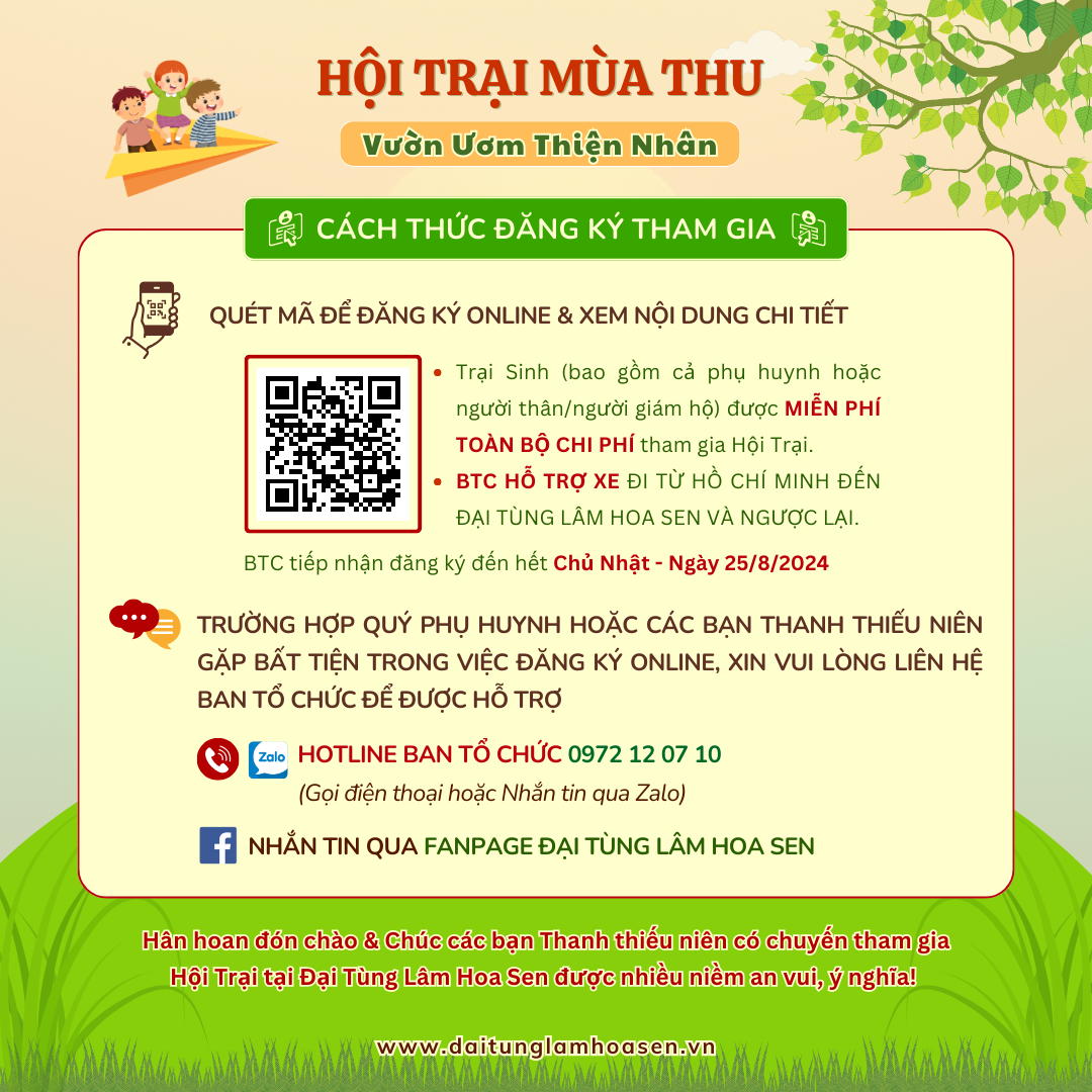 Ban Tổ chức xin trân trọng thông báo đến toàn thể Quý Trại sinh, các em Thanh thiếu niên, Học sinh, sinh viên các tỉnh, thành trên khắp cả nước được biết và sớm đăng ký cũng như chia sẻ, lan tỏa rộng rãi thông tin về Hội Trại Mùa Thu - Vườn Ươm Thiện Nhân đến người thân, bạn bè,… được biết để cùng đăng ký tham dự chương trình.