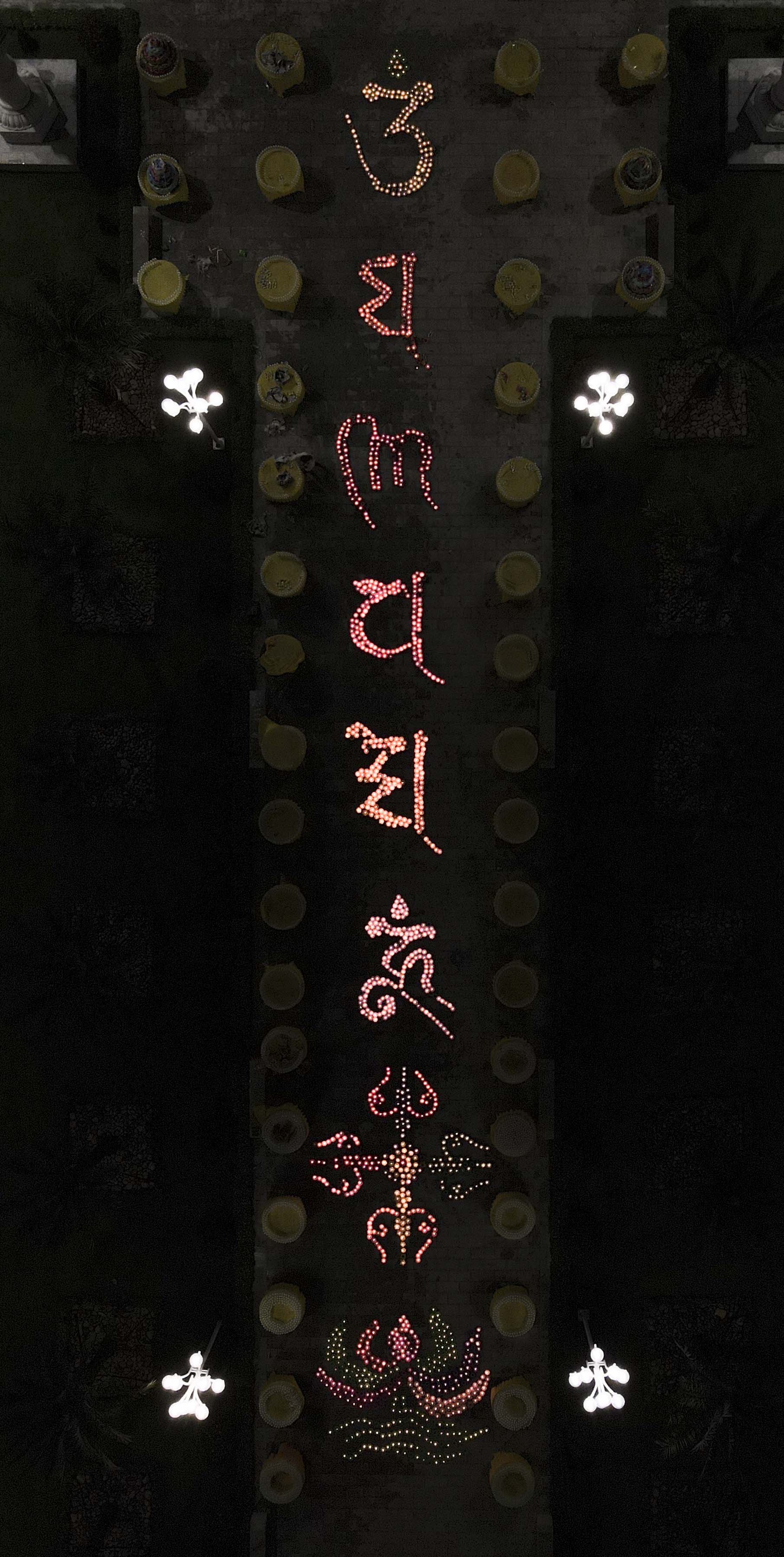 Hundreds of lanterns tied into the mantra "Om Mani Padme Hum" shine brightly in front of the main hall, helping the incense spirits not be born in the three lower realms but be reborn in the Western Land of Ultimate Bliss in the Pure Land itself